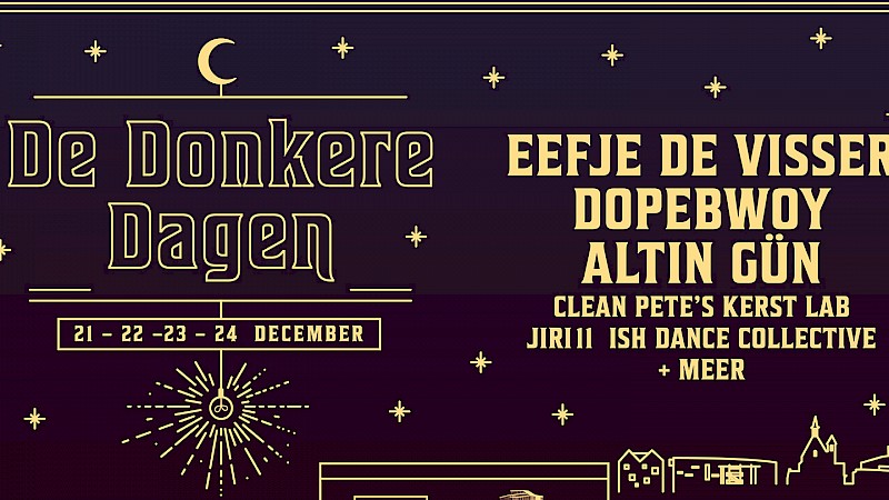 In fünf verschiedenen Hallen in Venlo findet kurz vor Weihnachten eine neue coronaproof-Veranstaltung statt Die dunklen Tage. Das Festival ist ein inspirierender Spaziergang entlang dieser Orte, in Gruppen von dreißig Personen. Eefje de Visser, Dopebwoy, Altin Gün, Clean Pete's Kerst Lab, ISH Dance Collective, Jiri11 und andere werden an den ersten drei Tagen auftreten. Das Fest endet mit einem besinnlichen Abend am Heiligabend: Christmas Night Venlo. Der Kartenverkauf beginnt am Freitagmorgen um 11:00 Uhr
