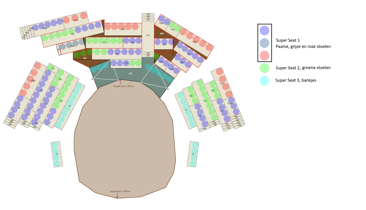 De Superseats bevinden in een halve cirkel als een toneelarena aan de achterkant van het podium. De enscenering wordt echt gemaakt met het publiek op het podium in gedachten, dus je kijkt niet alleen tegen de ruggen van de acteurs aan. Er zullen ook geen decorstukken voor Superseats staan.